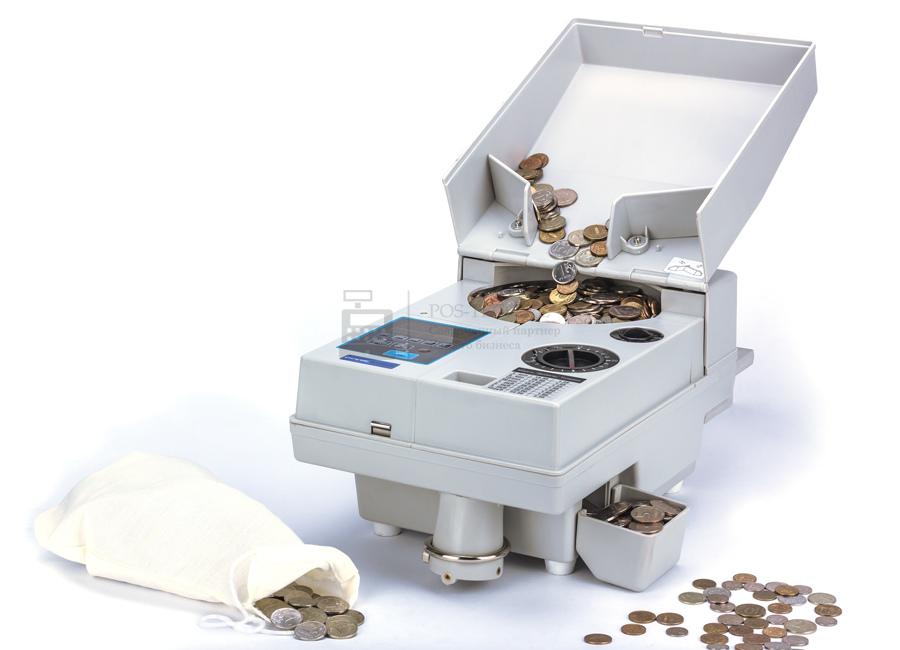 Скорость работы составляет 2500 экземпляров в минуту. Приемный лоток вмещает до 2000 монет. Устройство имеет 2 вида пересчета: непрерывный и с предустановленным количеством. При загрузке монет разного номинала прибор необходимо настраивать на больший по размеру образец из имеющихся. Корпус оснащен креплением для подвесного мешка. Металлическая конструкция гарантирует долгий срок службы устройства.